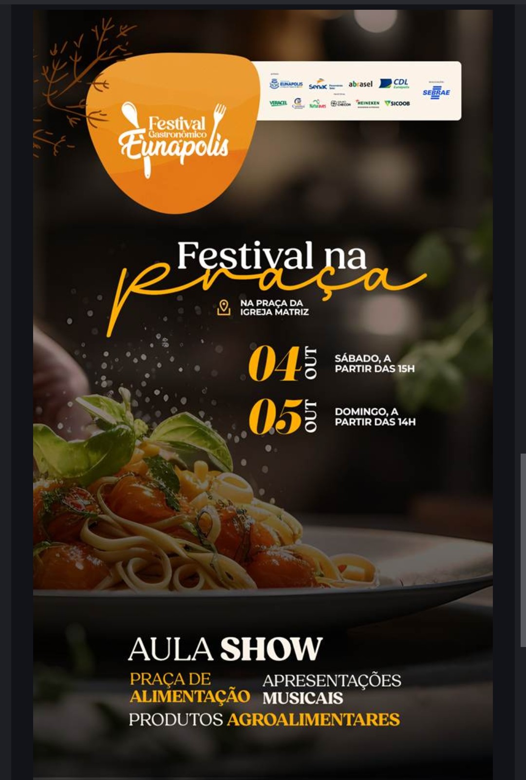 De 4 a 19 de outubro, a 6ª edição do Festival Gastronômico de Eunápolis reúne mais de 30 estabelecimentos e restaurantes locais, oferecendo uma variedade de opções para os amantes da culinária. Para marcar o início da temporada, nos dias 4 e 5 acontece o “Festival na Praça”, na Praça da Igreja Matriz, com aulas show de gastronomia, apresentações musicais e o melhor da culinária local.