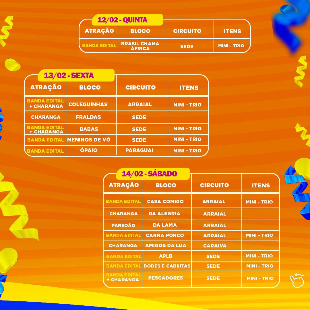 Em Arraial d’Ajuda e Caraíva, a festa também ganha as ruas. Na sexta (13), tem Coleguinhas, em Arraial. No sábado (14), saem Casa Comigo, Da Alegria, Da Lama e Carnaporco, em Arraial, além de Amigos da Lua, em Caraíva. O domingo (15) reúne Bandeirosas, Taquetá e Das Toalhas, em Arraial. Na segunda (16), desfilam Da Geladeira e Nega Folia, em Arraial, e Descarudas e Ninjas, em Caraíva. A terça (17) fecha a programação com Pholas e Pholinhas, Machuca e Trivelinha, na Praia dos Pescadores, e Oxi Pelé, em Caraíva.