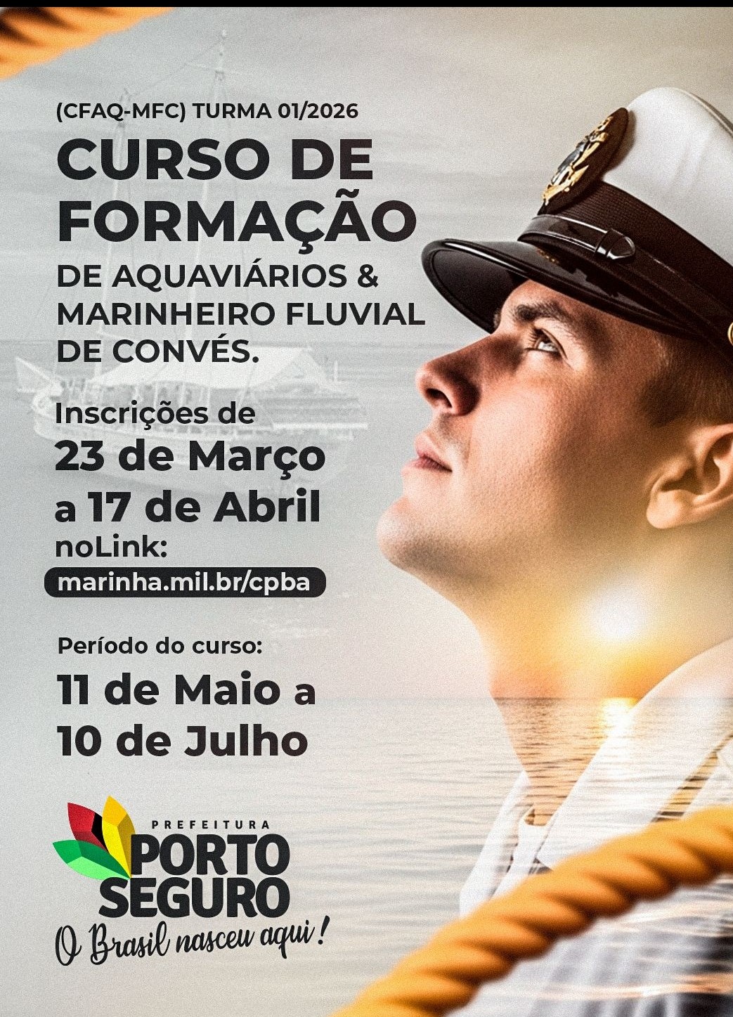 A Delegacia da Capitania dos Portos em Porto Seguro divulgou o edital do Curso de Formação de Aquaviários – Marinheiro Fluvial de Convés (CFAQ-MFC), turma 01/2026, uma oportunidade direta de qualificação profissional voltada ao transporte de passageiros na região, que desde 2022 não ocorria na cidade. As inscrições acontecem de 23 de março a 17 de abril, com curso previsto entre 11 de maio e 10 de julho. O edital está disponível no site da CPBA (https://www.marinha.mil.br/cpba/) e no Grupo de Atendimento ao Público (GAP) da DelPSeguro.