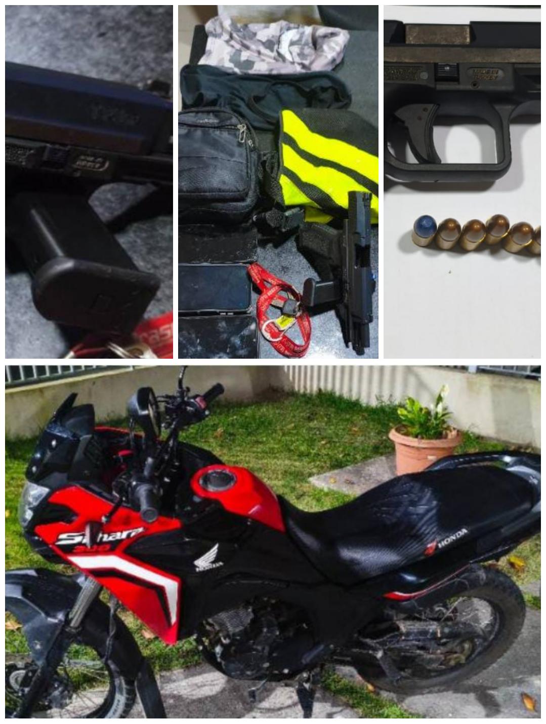 A dupla estava em uma motocicleta Sahara, cor vermelha, sem placa, cujas características coincidiam com o veículo utilizado em roubos de motocicletas realizados dias anteriores.