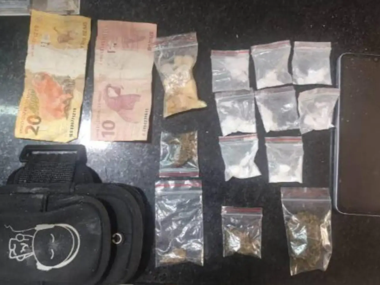 Ao perceberem a aproximação da viatura, os suspeitos tentaram fugir. Durante o acompanhamento, um dos indivíduos foi alcançado, sendo encontrado em sua posse uma pochete contendo 4 papelotes de maconha, 8 papelotes de cocaína e 12 gramas de crack.