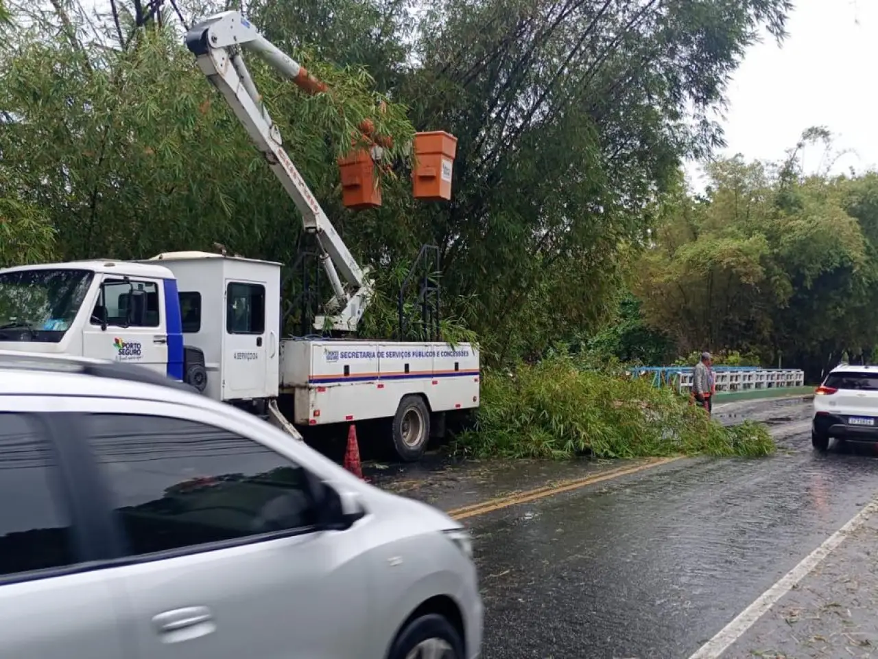 Em sistema de mutirão, as equipes atuaram na retirada de árvores, postes e placas caídos, além da limpeza de vias e apoio às áreas afetadas. O trabalho foi feito com máquinas e homens e se concentrou principalmente na Orla Norte, Centro, Frei Calixto e Arraial d’Ajuda, mas também chegou a outras localidades.