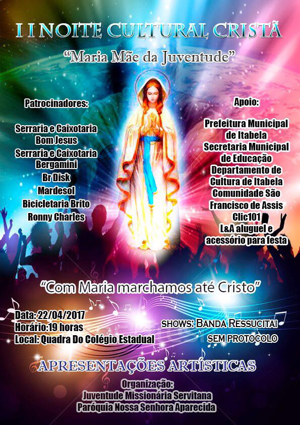 A II Noite Cultural Cristã vai ocorrer na Quadra do Colégio Estadual Antônio Carlos Magalhães, à rua ACM, s/nº, Centro – Itabela, oferecendo aos presentes uma noite com muita música, apresentações artísticas, louvor, oração. Sob o tema “Maria Mãe da Juventude” e o Lema “Com Maria marchamos até cristo.
