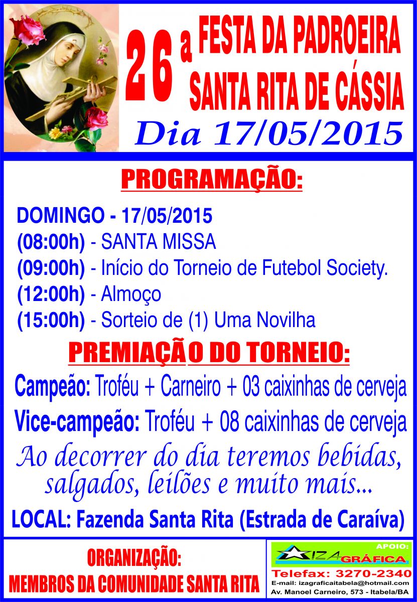 Durante todo o dia deste domingo (17/05) será comemorada na Fazenda Santa Rita a 26ª Festa da Padroeira Santa Rita de Cássia.
