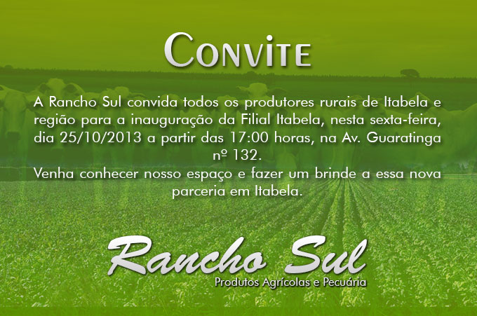 Todos os produtores rurais, especialmente de Itabela e região, estão convidados para a inauguração, quando serão apresentadas suas instalações e feito um brinde a essa nova parceria da Rancho Sul com a classe produtora.