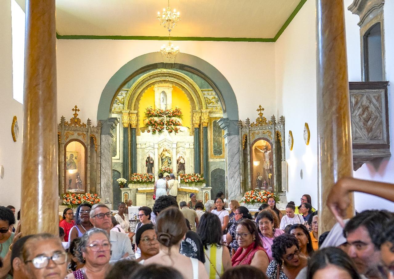 Às 15h, a Missa dos Romeiros abriu caminho para a tradicional procissão, conduzida pelo Padre Vilmar e Padre Diego. Próximos ao andor com a imagem da Santa, eles seguiram entoando cânticos de louvor, acompanhados pelas filarmônicas Dois de Julho e Lyra Popular. “As filarmônicas integram o projeto Concertos, onde a fé se expressa pela música, de forma cantada e tocada”, ressaltou o superintendente de Cultura, Herculano Assis. A caminhada percorreu o centro histórico do distrito e retornou ao santuário, reunindo fiéis, romeiros e visitantes em um momento marcado pela fé e emoção.