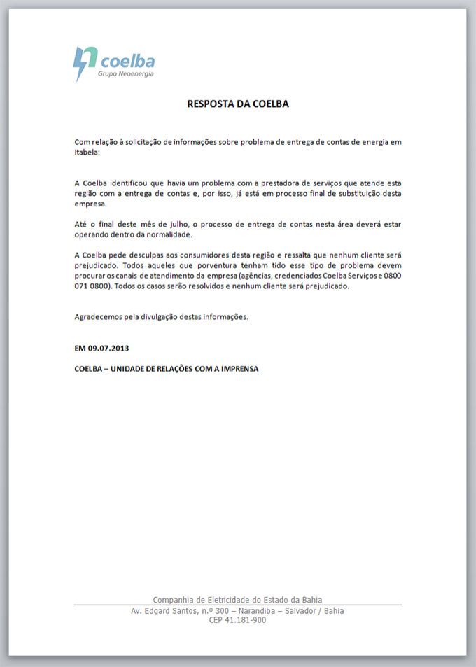 Em resposta,a Coelba emitiu o seguinte comunicado.