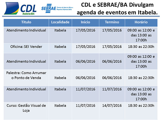 Em contato com a senhora Jane Silva, Analista Técnica do Sebrae em Eunápolis e responsável pela atuação do órgão em Itabela, ouvimos relato semelhante ao do diretor da CDL, e mais, que diante de tantas dificuldades enfrentadas e tantos problemas gerados, foi solicitada a cancelar os eventos agendados para o restante deste ano.