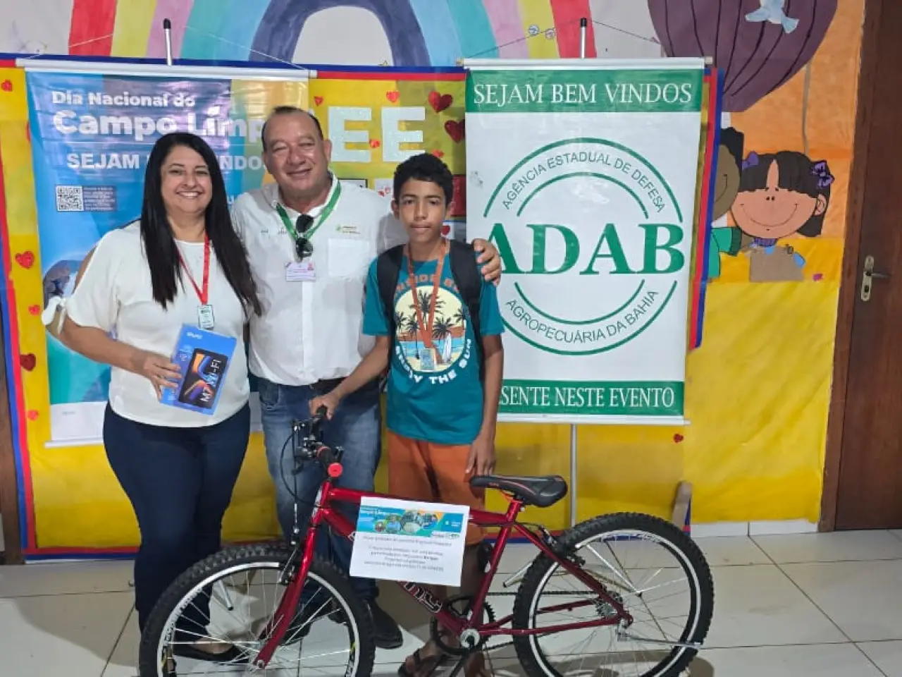 O Aluno ganhador (Redação): Waly Bispo Cruz — O aluno foi premiado com uma bicicleta patrocinada pelo empresário Bergue, Engenheiro Agrônomo (consultoria agrícola contato 73 981084339), uma medalha de AMIGO DO CAMPO LIMPO, além de uma mochila repleta de itens escolares oferecida pelo sistema Campo Limpo.