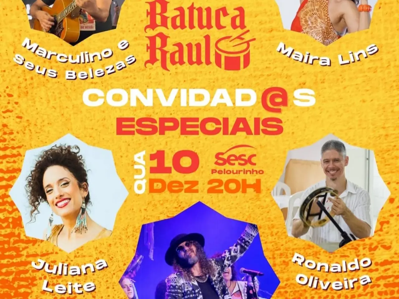 No Batuca Raul desta quarta o grupo recebe vários convidados, como: Marcus Clement, Maira LINS, Marculino e suas Belezas, Juliana Leite e Ronaldo Oliveira, que somam força, poesia e liberdade ao encontro percussivo, e pra segurar o groove da noite a banda base da oficina de sons formada por Antenor Cardoso na bateria, guitarra e direção musical de Marcos Bezerra, cavaco com Antônio Carvalhal, Marcelo Flores no teclado e no baixo, Marcelo Rocha.
