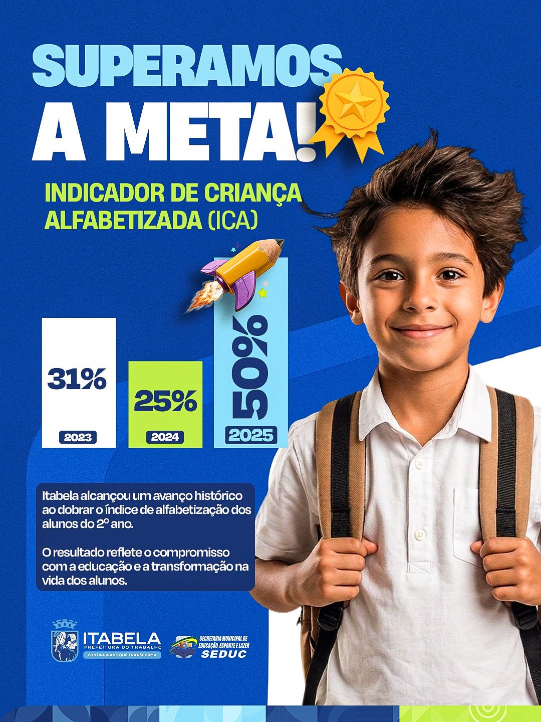 O município de Itabela celebra um marco histórico na educação ao superar com folga a meta do Indicador de Criança Alfabetizada (ICA), atingindo 50% de alunos alfabetizados no 2º ano do ensino fundamental. O resultado representa um salto extraordinário na aprendizagem e reforça o compromisso da gestão municipal com o futuro das crianças.