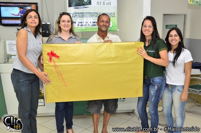 Na segunda-feira (9), pela terceira vez o Sicoob Itabela entregou um televisor 3D Led 42 polegadas a um cliente da agência contemplado no sorteio da Capitalização Premiada. Desta vez, o felizardo foi o pedreiro João Santos de Almeida, que recebeu o seu prêmio entregue pela gerente Adriana Barbosa e as colaboradoras Juliana, Iara e Valquíria.