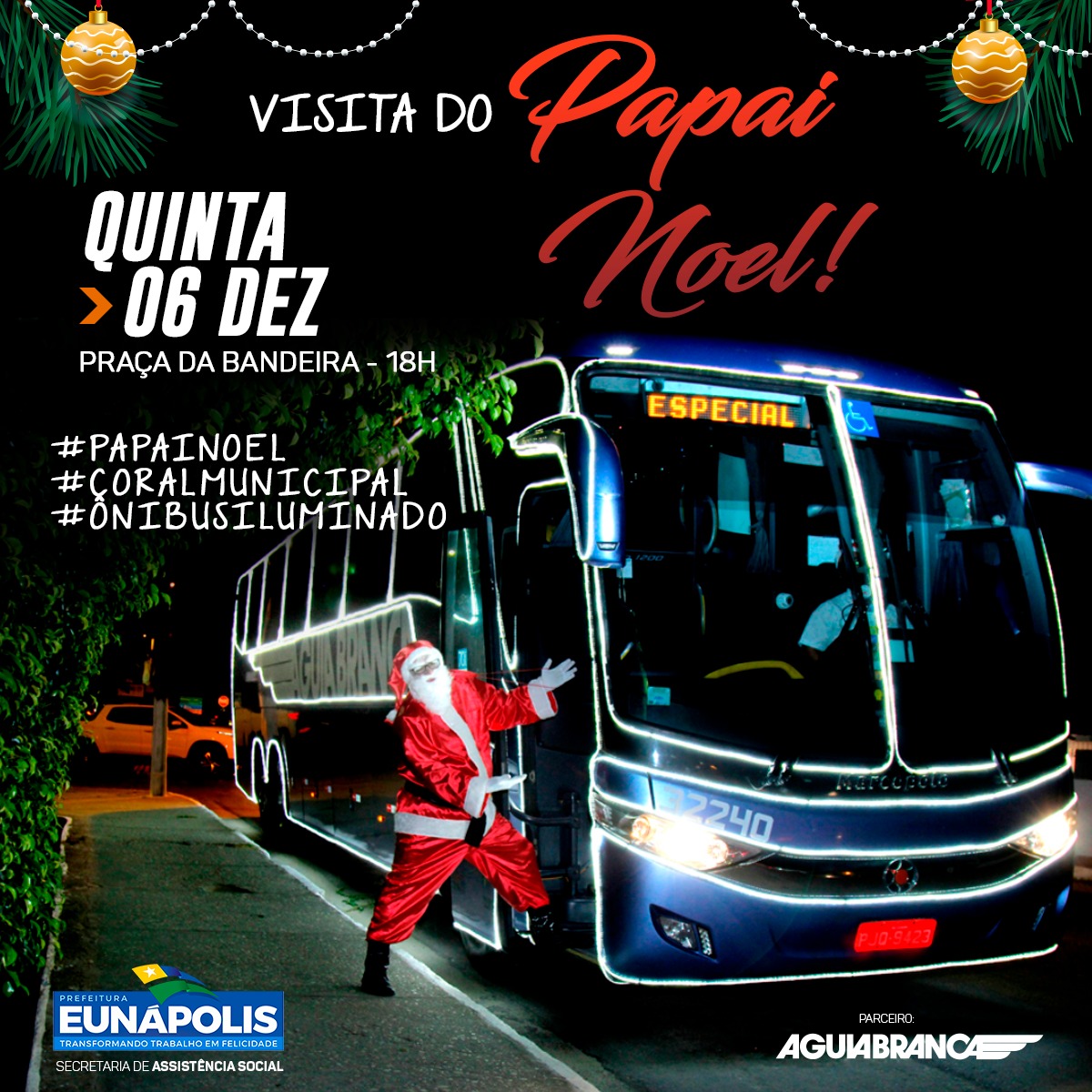Uma parceria da Prefeitura de Eunápolis, por meio das secretarias de Assistência Social e Educação, com a empresa Águia Branca, possibilitará a visita do Papai Noel nesta quinta-feira, 06/12. O evento acontecerá na Praça da Bandeira, a partir das 18h, e contará também com apresentação do Coral Municipal e um ônibus totalmente iluminado.