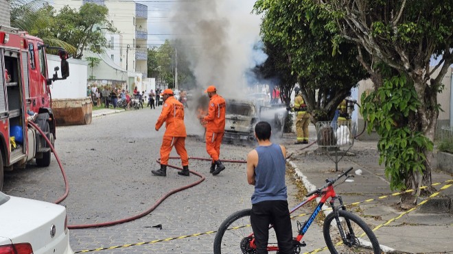 Carro pega fogo e explosão assusta moradores em Eunápolis