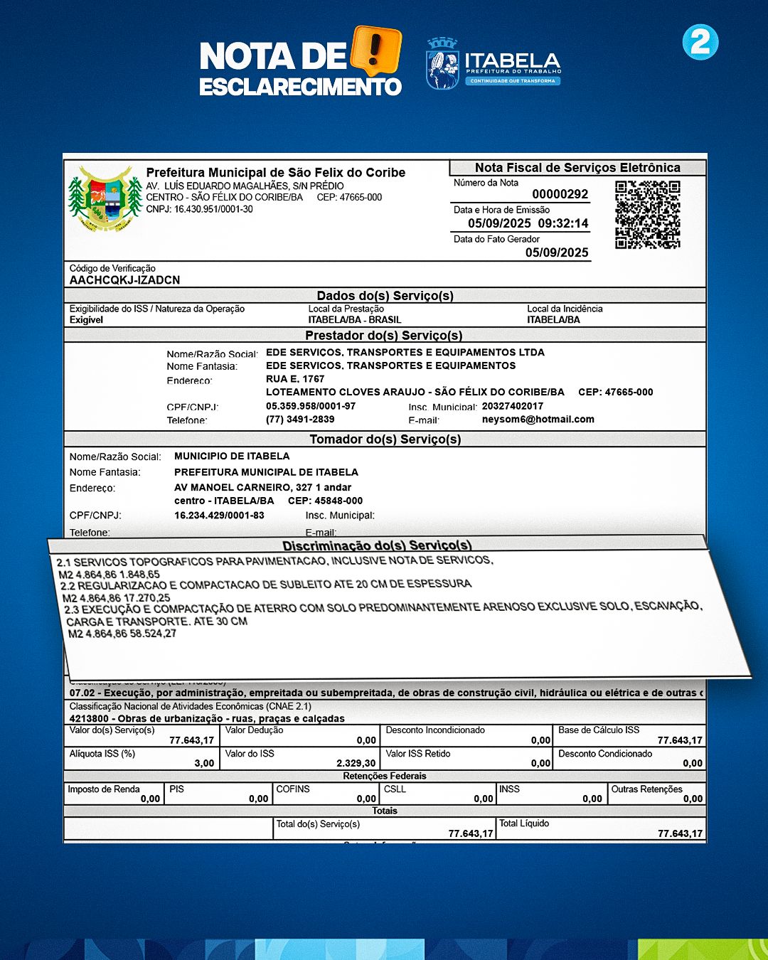 De acordo com a administração municipal, o documento divulgado trata-se, na verdade, de uma nota de empenho referente a serviços de estudo topográfico, cobertura e compactação da via, conforme descrito na nota fiscal emitida pela empresa contratada. Em nenhum momento houve pagamento por pavimentação.