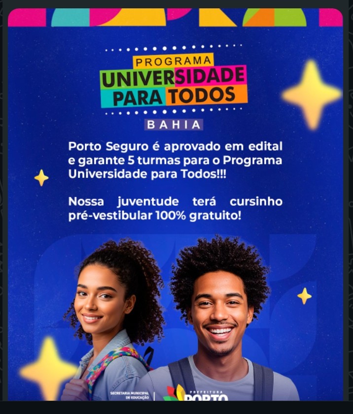 A Prefeitura de Porto Seguro anunciou a implantação do programa Universidade Para Todos, iniciativa voltada para jovens que desejam ingressar no ensino superior ou se preparar para o processo seletivo do Instituto Federal da Bahia (IFBA).
