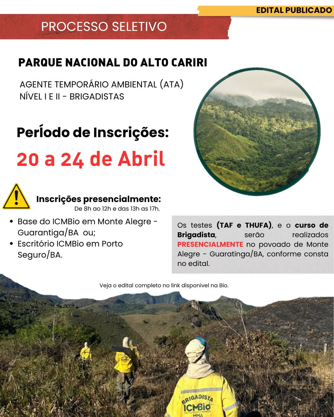 Edital completo pode ser acessado no link https://www.gov.br/icmbio/pt-br/assuntos/protecao/seja-um-agente-temporario-ambiental/2026/gr-2-nordeste/processo-seletivo-agente-temporario-ambiental-parna-alto-cariri