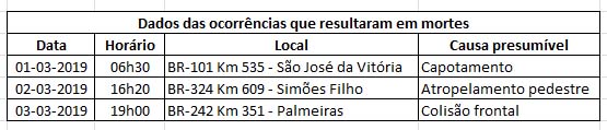 Em relação ao mesmo período do ano anterior, a PRF na Bahia registrou uma redução de 31% no número de acidentes totais, 75 em 2018 contra 52 este ano. Destes, 13 foram acidentes graves, quando resultam em, pelo menos, um óbito ou ferido gravemente. Do total de acidentes registrados, 60 pessoas ficaram feridas, número que representa uma redução de 24% em relação ao mesmo período do ano passado. Este ano, 03 pessoas morreram durante o feriado nas rodovias federais baianas, redução de 50% com relação ao ano anterior, quando 06 pessoas vieram a óbito.