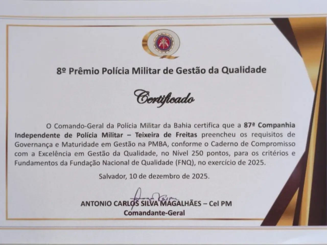 A certificação atesta que a 87ª Companhia Independente de Polícia Militar preencheu todos os requisitos de governança e maturidade em gestão estabelecidos pela PMBA, conforme o Caderno de Compromisso com a Excelência em Gestão da Qualidade, no nível de 250 pontos. A avaliação segue os critérios e fundamentos da Fundação Nacional da Qualidade (FNQ), referentes ao exercício de 2025, consolidando a unidade como referência interna em boas práticas administrativas e organizacionais.