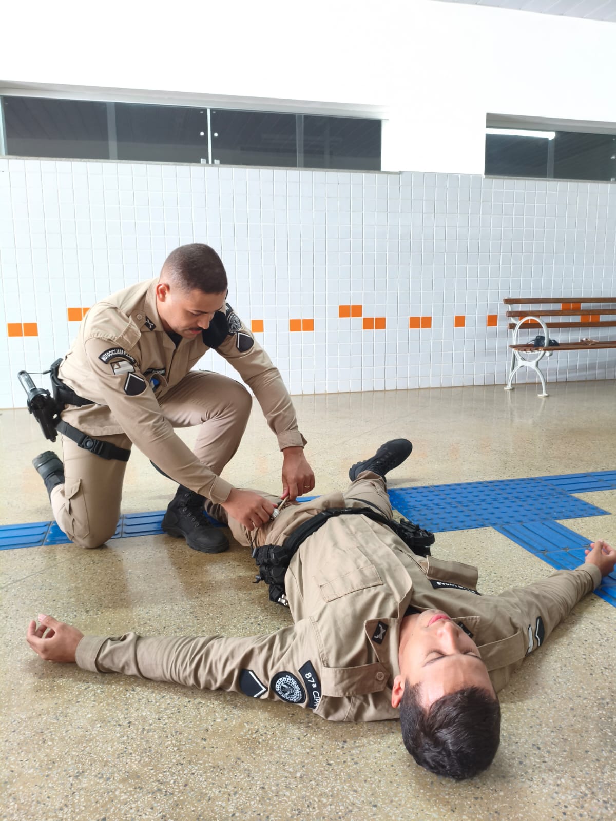 Na etapa prática, os policiais participaram de uma oficina de aplicação de torniquete com material de treinamento, permitindo que o efetivo praticasse a técnica, esclarecesse dúvidas e reforçasse a confiança no uso do equipamento em situações reais.
