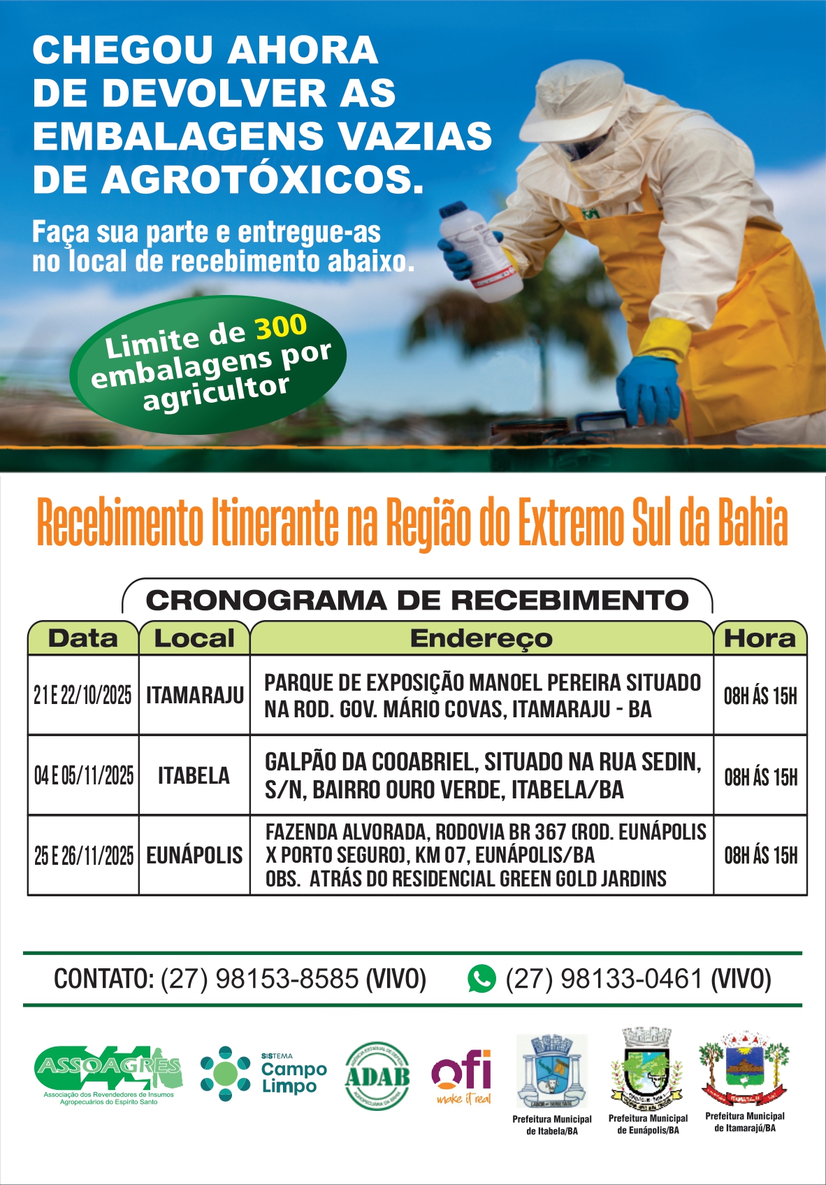 ATENÇÃO: Nesta terça (4) e quarta-feira (5), entregue suas embalagens vazias de agrotóxicos no RI de Itabela