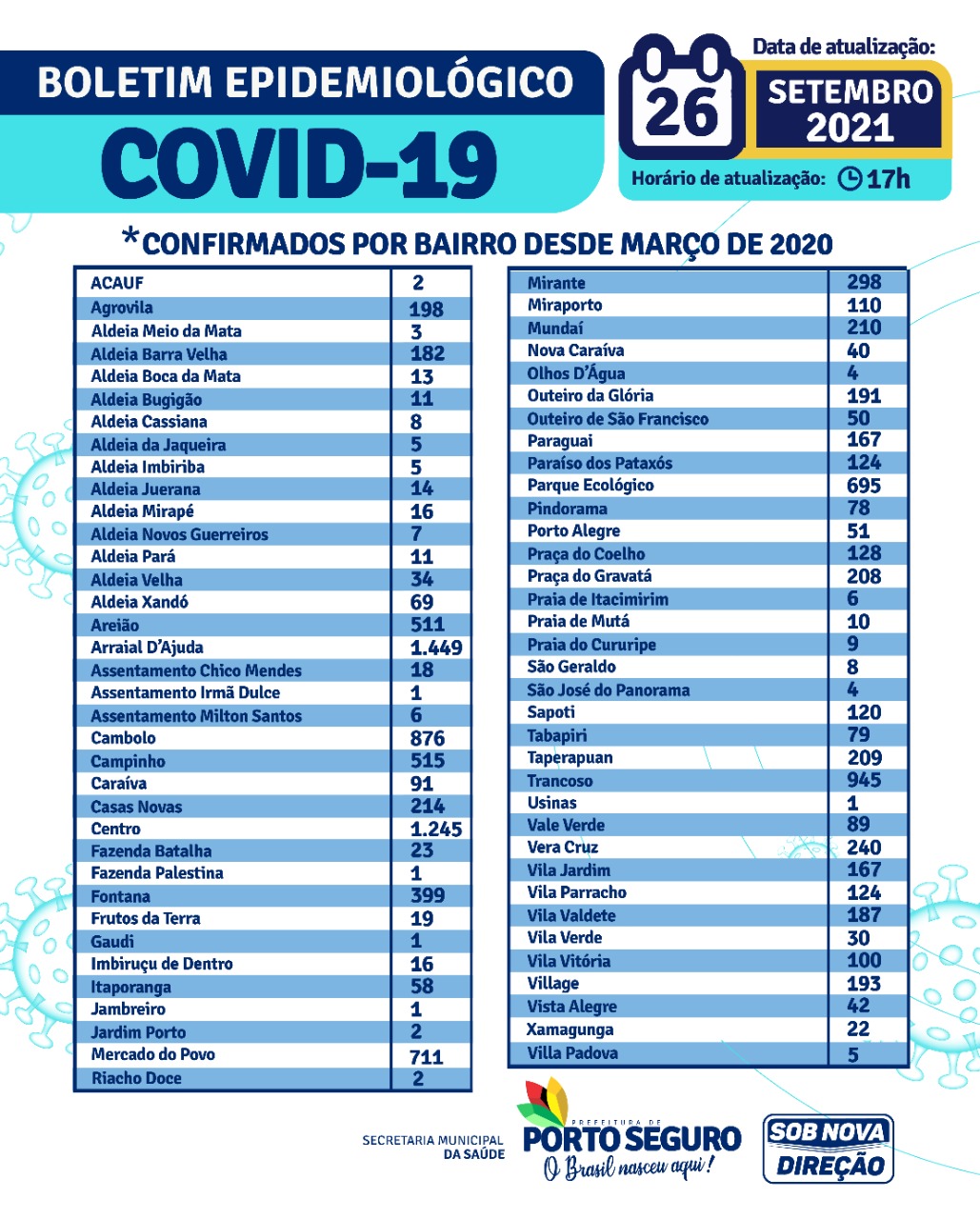 A Prefeitura de Porto Seguro, através da Secretaria Municipal de Saúde, informa que no período de 14/03/2020 a 26/09/2021, foram 26.509 casos de COVID-19, sendo 11.682 confirmados e 14.827