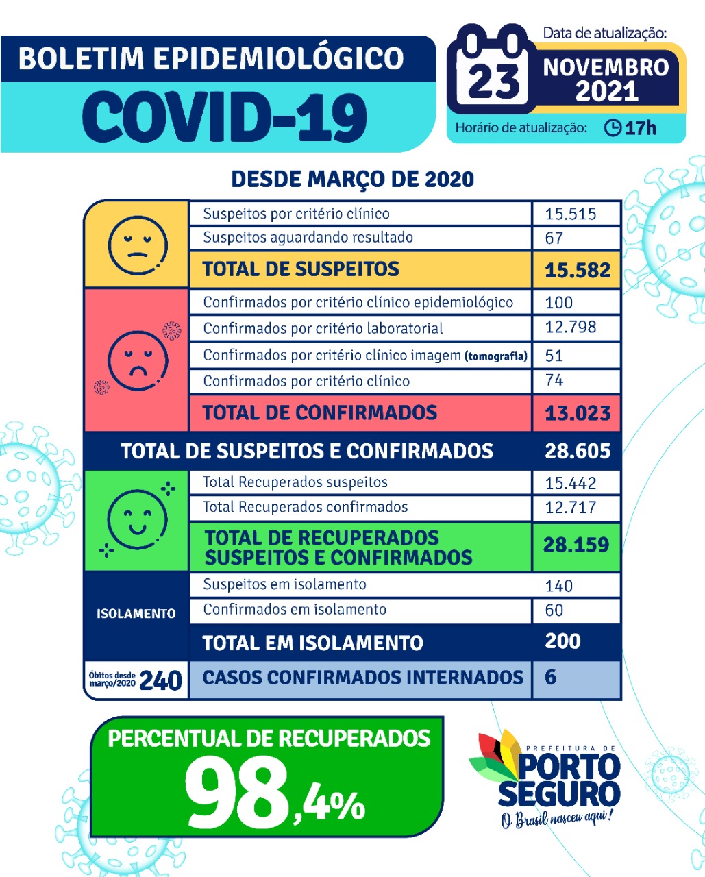 A Prefeitura de Porto Seguro, através da Secretaria Municipal de Saúde, informa que no período de 14/03/2020 a 23/11/2021 foram 28.605 casos de COVID-19, sendo 13.023 confirmados e 15.582 suspeitos, classificados de acordo com a sintomatologia clínica.