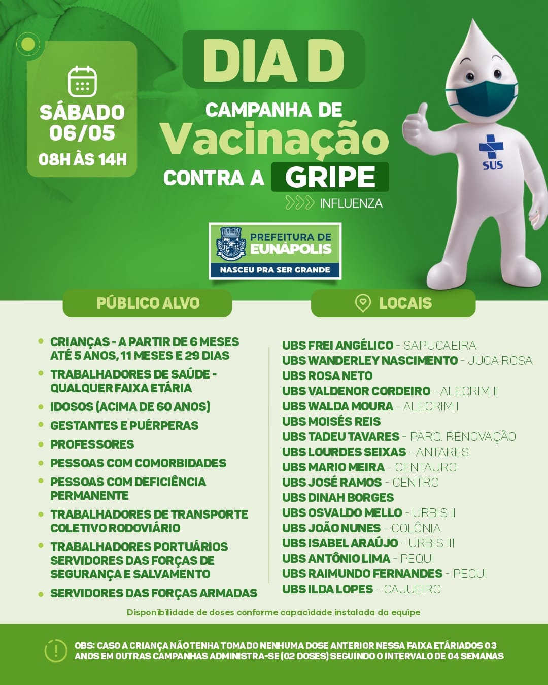 A Prefeitura de Eunápolis, por meio da Secretaria Municipal de Saúde, informa à população eunapolitana que realizará o Dia D da Campanha de Vacinação Contra a Influenza (gripe) neste sábado (06). A imunização estará disponível nas Unidades Básicas de Saúde com salas de vacina ativa, das 8h às 14h.
