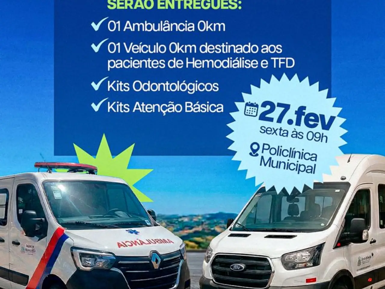 Serão entregues uma ambulância 0km, um veículo 0km para pacientes de hemodiálise e TFD, além de kits odontológicos e kits de atenção básica, garantindo mais estrutura e melhores condições de atendimento para a nossa gente.