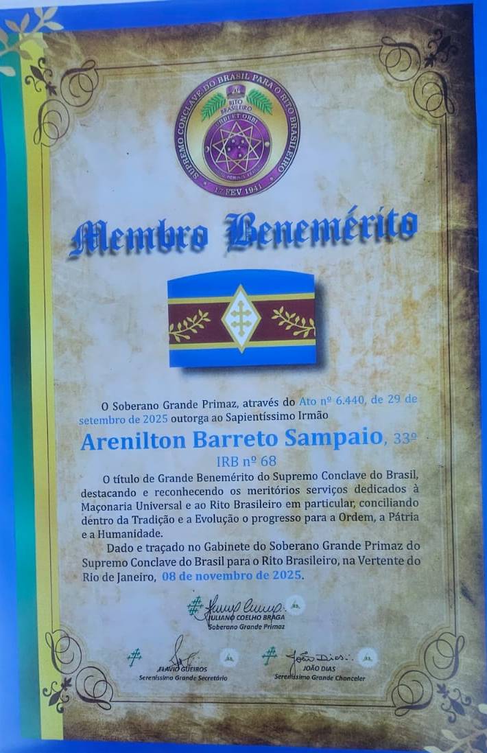 HOMENAGEM: Arenilton Barreto Sampaio, uma vida dedicada à Maçonaria, é homenageado com o honroso título de Grande Benemérito do Supremo Conclave do Brasil