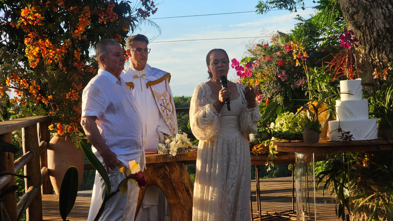 Emoções e lágrimas rolaram durante o ato religioso conduzido pelo padre Alessandro, no deck, em ambiente bucólico lindamente decorado e com vista para o pôr do sol do vale.